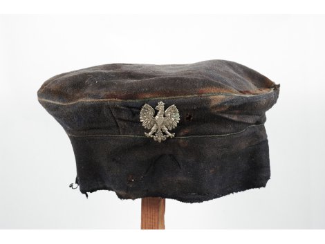 | Opis | Fragment czapki policjanta,część daszka bez okucia oraz z orzełkiem |